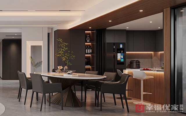 以现代设计手法诠释高贵典雅,将折线、圆形、等简洁的元素融合入造型设计中,并结合富有质感的材料,打造出集简约、时尚、奢华于一体的居家空间,给予主人一个富有轻奢气质的就餐环境。