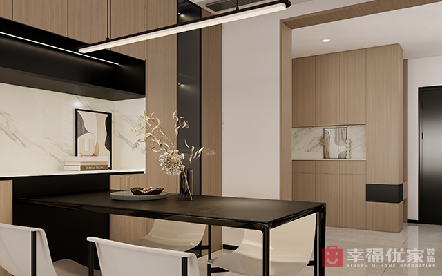 客厅为原木色调,家具则采用浅色,极简的氛围感加上清雅干净的设计显示出了独特的美感,无主灯的客厅加上多彩变换的自然光影效果造就了这一时尚感强烈的空间。餐厅与西厨的一体化设计更加开阔了视野,使得餐厅厨房在视觉上有所延伸,家具搭配也顺应氛围营造,主要采用的是原木和灰色,色调采用简洁,简约大气的设计更加适合居住。主卧采用深色调,这样做的目的是更加有隐私感,搭配中亦不缺乏美感,更加适合用来放松和休憩,加上柔软舒适的床品能让屋主得到更加充分的休息。