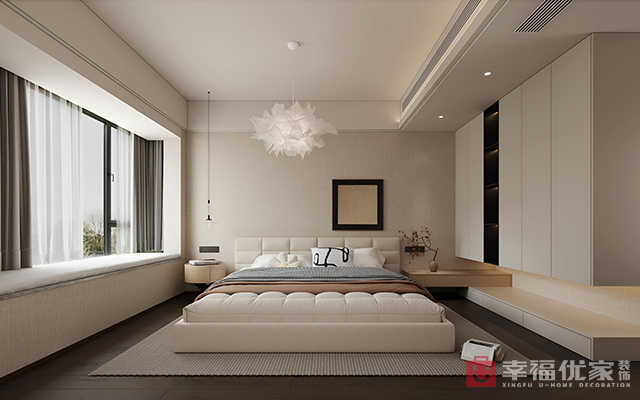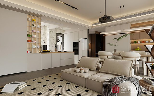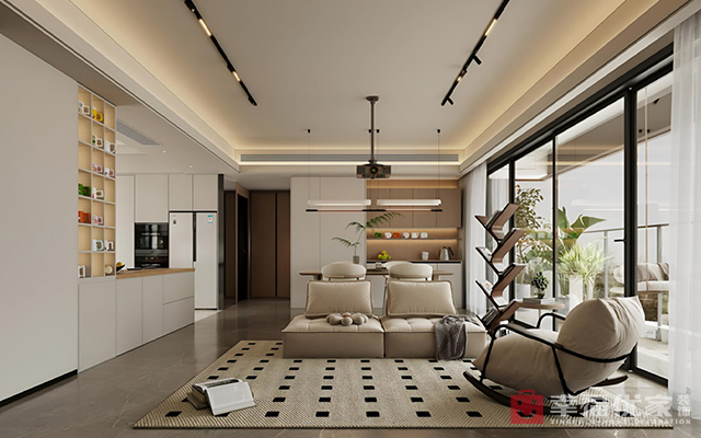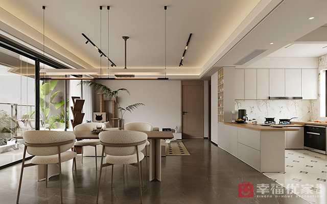原本是精装房,因套四改套三,原始厨房太小,就把卧室和厨房结合到一起,做成了开放式的中西厨结合。整体的色彩搭配以浅色为主题,木纹辅助的形式呈现出了现代风