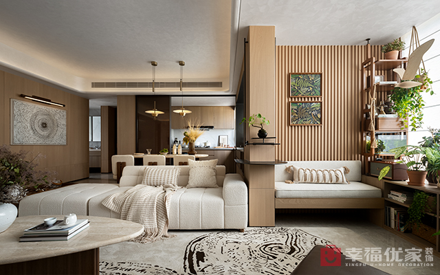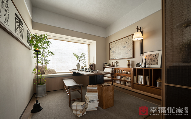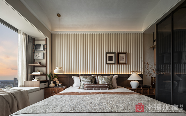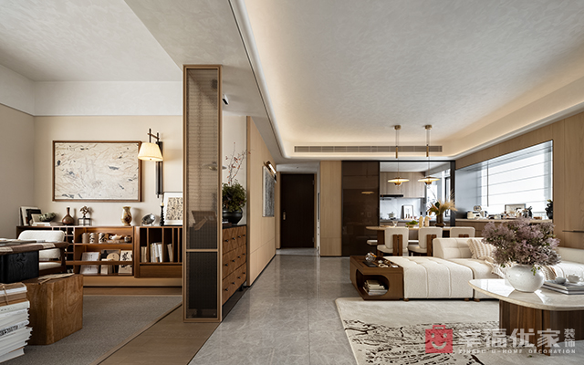 中式古典家具配现代软装,米白为主调,局部跳色,静暖氛围盈。