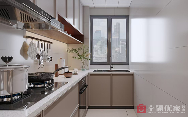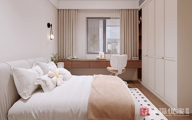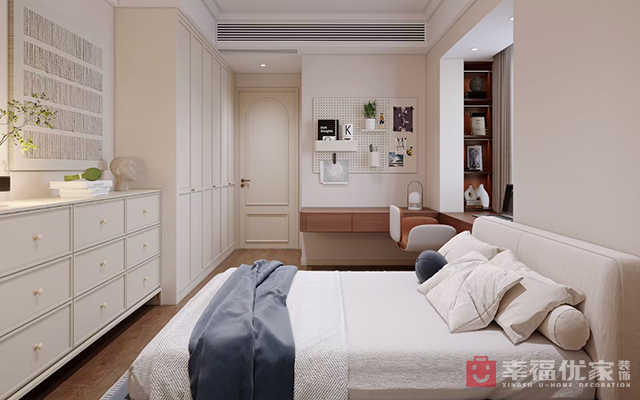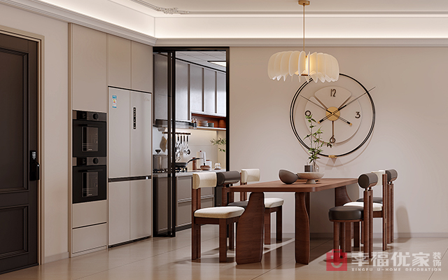 现代风格和中古风格的结合,显得简单并有书卷气。厨房外移到生活阳台餐厅更有开阔性。儿子房间在足够满足功能需求的同时体现温馨的童趣色彩。