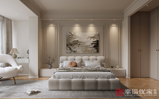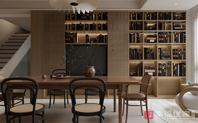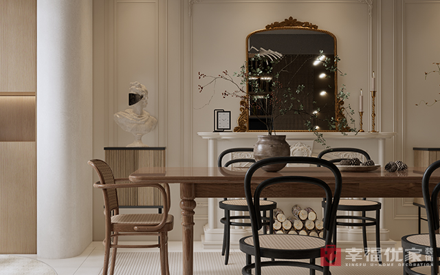 地面使用暖色地砖,使用墙面使用线条,筒灯光影,顶面的线条,原木色柜体桌椅搭配,营造法式原木的美感和浪漫。