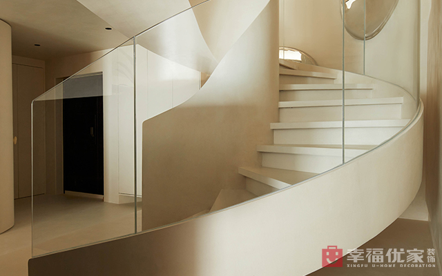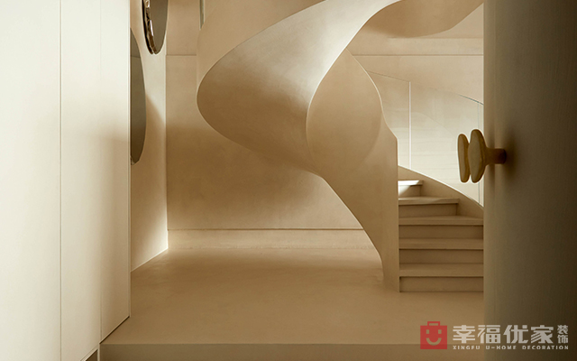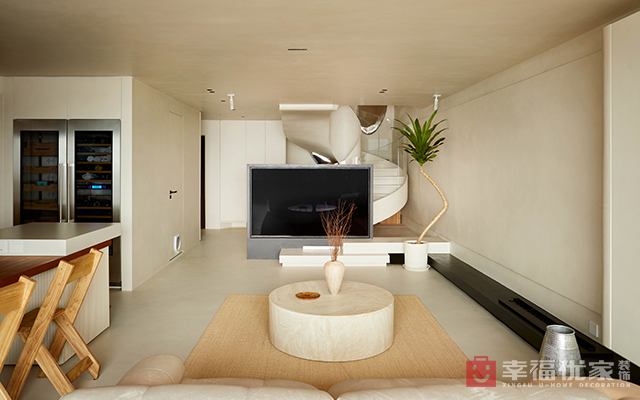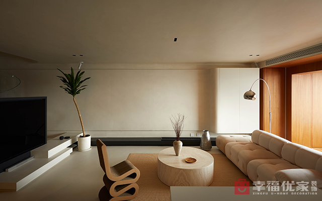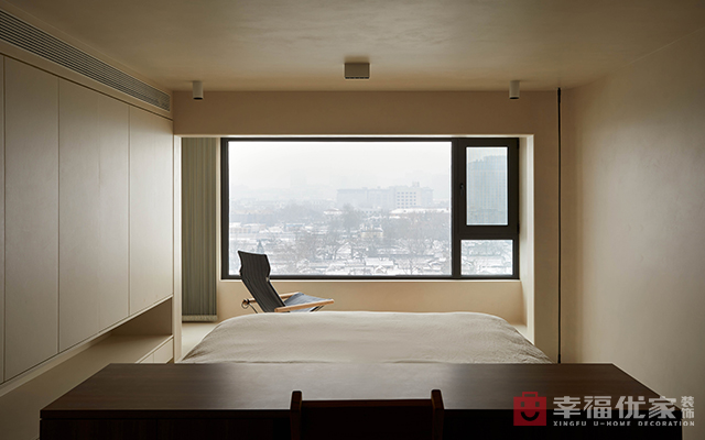 起居室长窗是住宅内绝佳的观景之处。为了突出强化室外独特景致,我们利用低压的梁体加以深色木饰面的整体包裹,打造被拉长的框景效果,使空间具有场景感,延伸感。