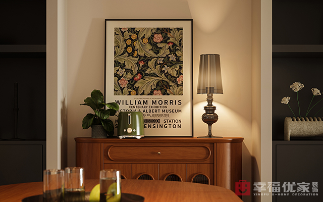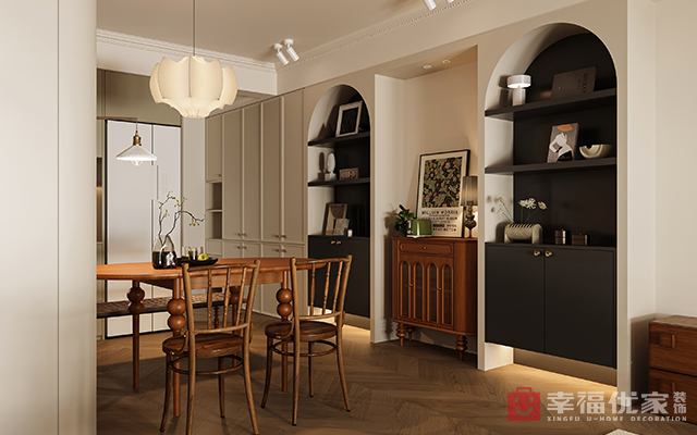 暖白的墙面和黑色做碰撞,在满满故事感的胡桃木色家具的加持下,整个空间,像是一本念不完的故事书。