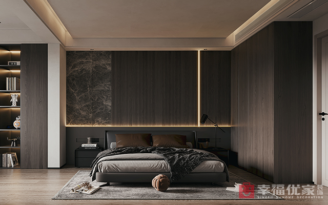 以黑白灰为基底,公共区用浅灰柔化空间,适配三口之家日常互动;男孩房采用黑色系,搭配原木与金属元素,既显意式利落,又为男孩打造酷感且具成长感的私人领域。