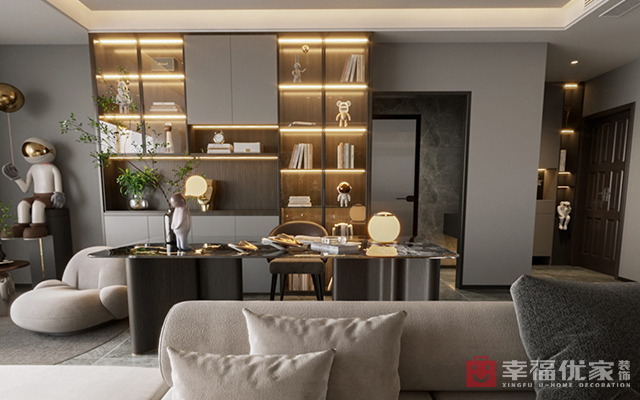 客户一人独居中年成功人士,中铁高管,设计风格低调奢华为主,整个客餐厅56平为客户的主要活动空间,对新鲜事物的追求不同于其他大多数客户,全屋以深色调为主,无主灯的设计,皆符合客户需求,全屋动线舒适大气,深的客户喜爱,低调的同时尽显奢华。将生活融入设计。